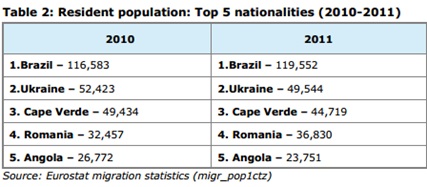 At present, there are over 445,000 regular migrants residing in Portugal (2010), accounting for about 4 per cent of the total population. Considering the reality of these migration flows particularly the high inflow of Brazilian migrants, populations from Portuguese-speaking countries in Africa and labour migrants from Eastern Europe, IOM assists and works together with the Portuguese Government in migration management in the fields of assisted voluntary return and reintegration, counter-trafficking, migration and development, labour migration and integration